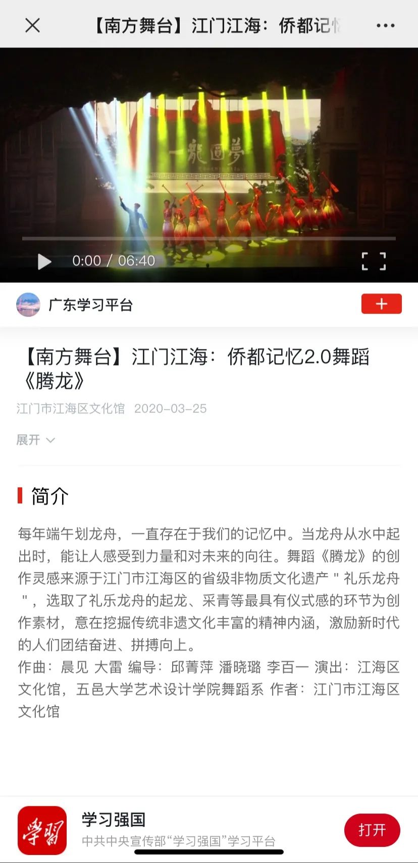 近日,由由高新区(江海区)宣传文化部门重点打造的“立足江海,放眼五邑”的原创音画、江门首部反映五邑非遗及民俗文化的大型文艺作品——《侨都记忆》2.0版中舞蹈《腾龙》,由于别具特色,登上了学习强国平台,广受好评。今天,请随小编来走近这首作品。